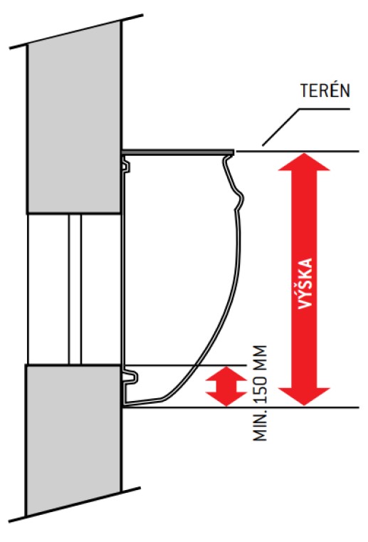 - Od parapetu okna po čistý terén + 150 mm = min. výška světlíku.